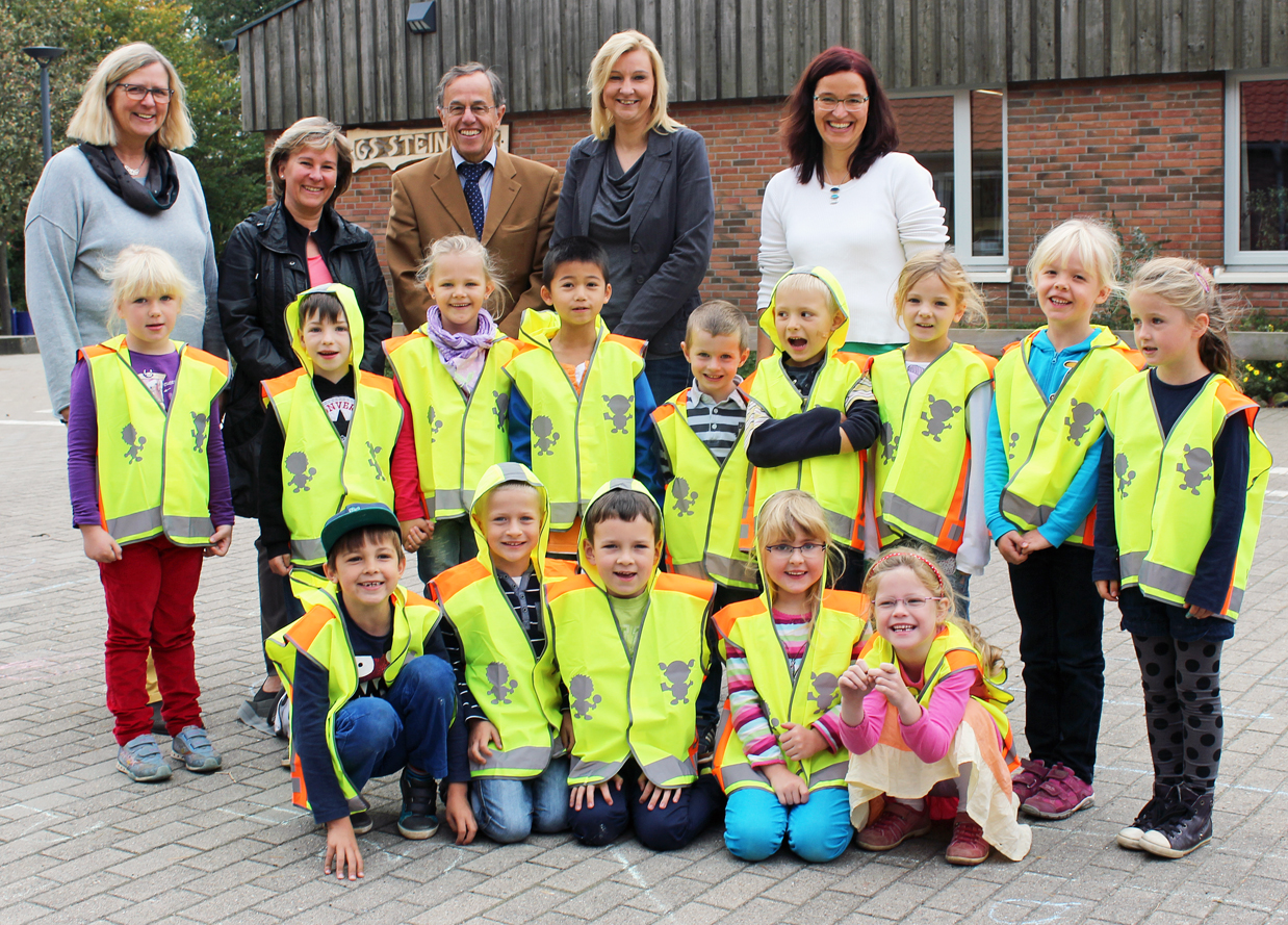 Ob auf dem Schulweg oder beim Spielen, Kinder müssen im Straßenverkehr rechtzeitig erkannt werden. Deshalb verteilt die ADAC Stiftung "Gelber Engel" bundesweit kostenlose Sicherheitswesten für Schulanfänger. In Buchholz bekommen acht Grundschulen die gelben, Licht reflektierenden Westen. Bürgermeister Wilfried Geiger und Vertreter des "AC Buchholzer Heidering" haben diese, für jedes Kind der 1. Klasse von der GS Steinbeck, offiziell übergeben. Schulleiterin Marlies Prütz findet die Aktion sehr sinnvoll. In der Grundschule wird auch im Unterricht über die Gefahren und Risiken im Straßenverkehr mit den Kindern gesprochen.